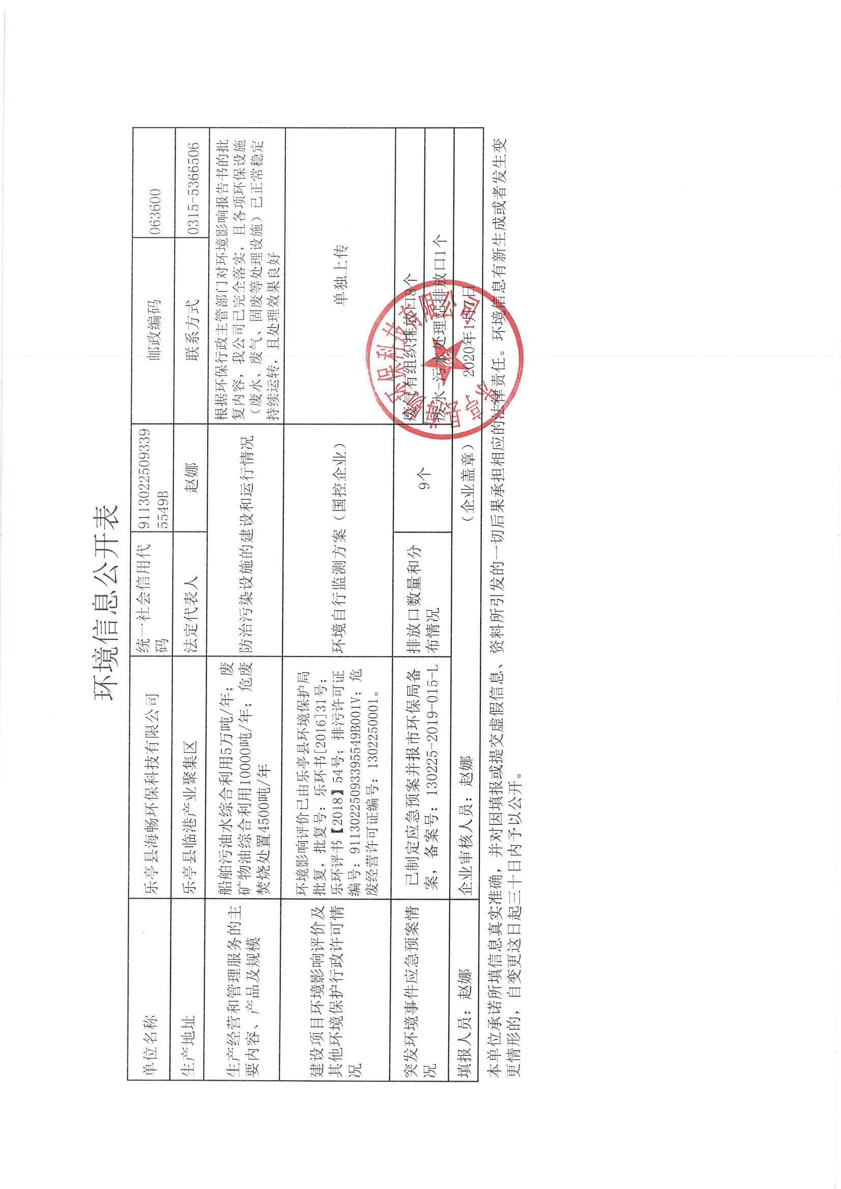 樂亭縣海暢環(huán)保科技有限公司環(huán)境信息公開表